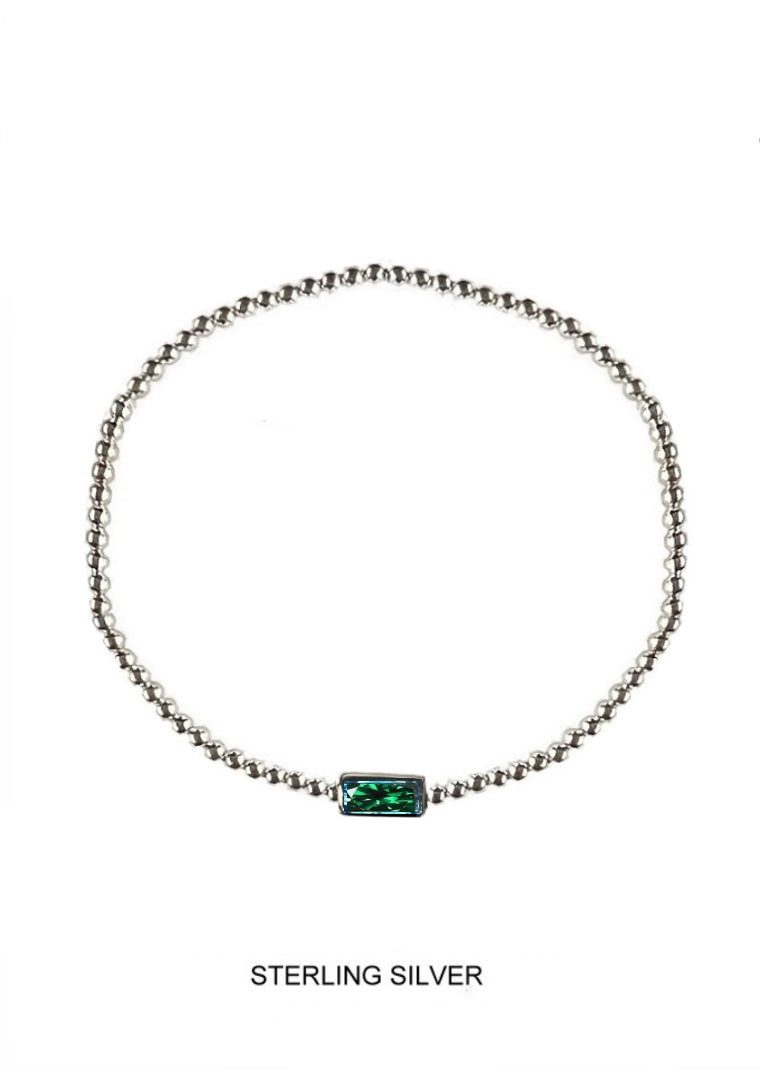 Chic and versatile, Clover features polished silver beads and a deep emerald green CZ baguette centerpiece.