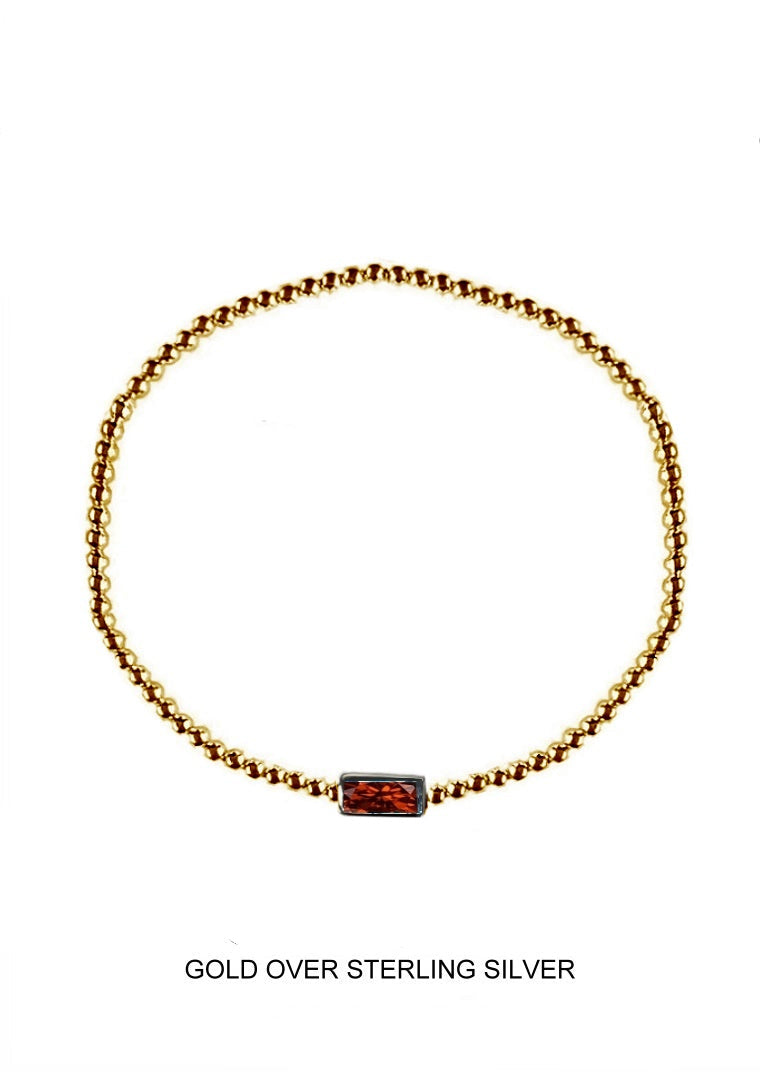Bold yet timeless, Crimson features polished gold beads and a striking red CZ baguette centerpiece.
