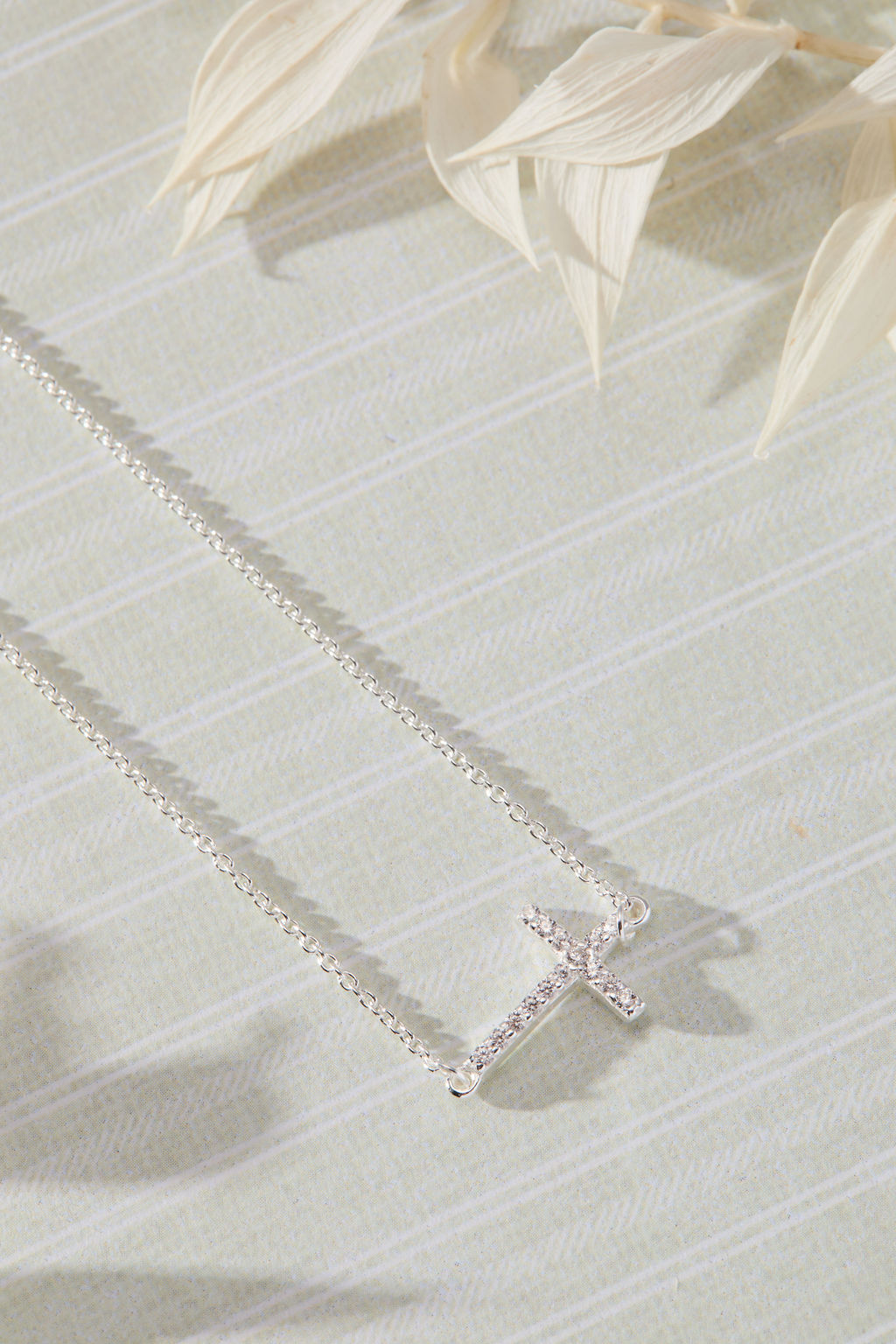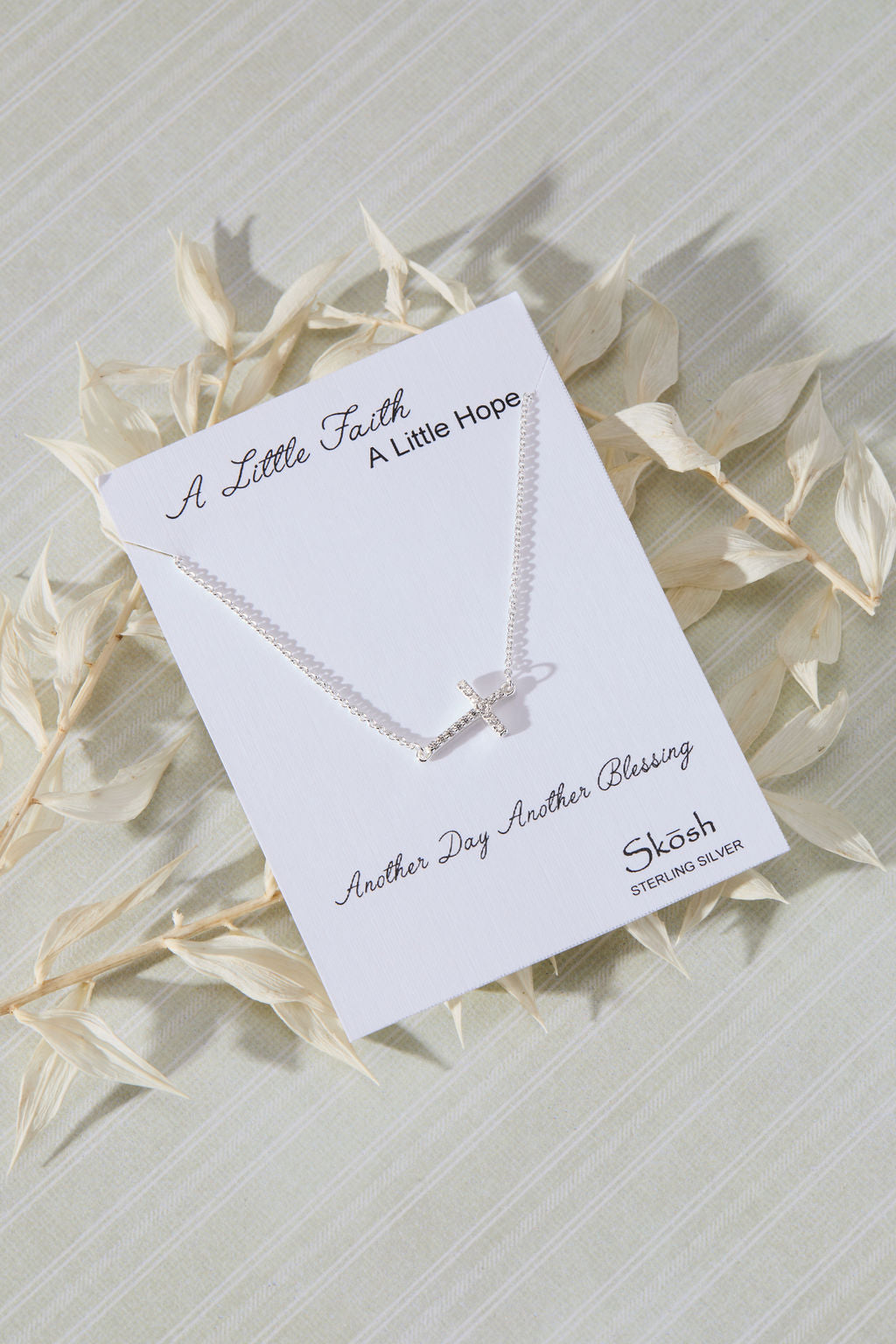 A subtle yet powerful symbol of unwavering faith, the Devoted necklace features a sleek sideways cross accented with sparkling cubic zirconia. Crafted in sterling silver, it hangs gracefully on a 16" chain with a 1" extender. Perfect for layering or wearing solo, this piece is a daily reminder to stay steadfast in belief and love.