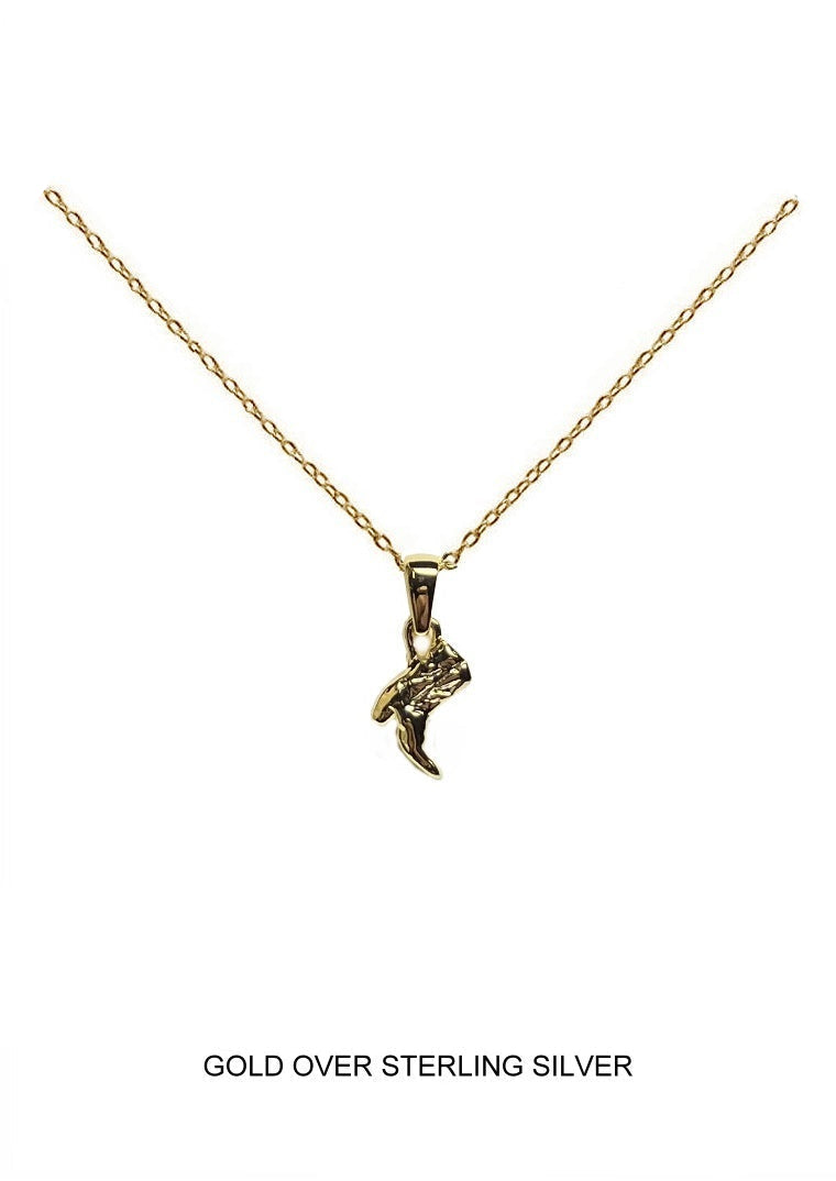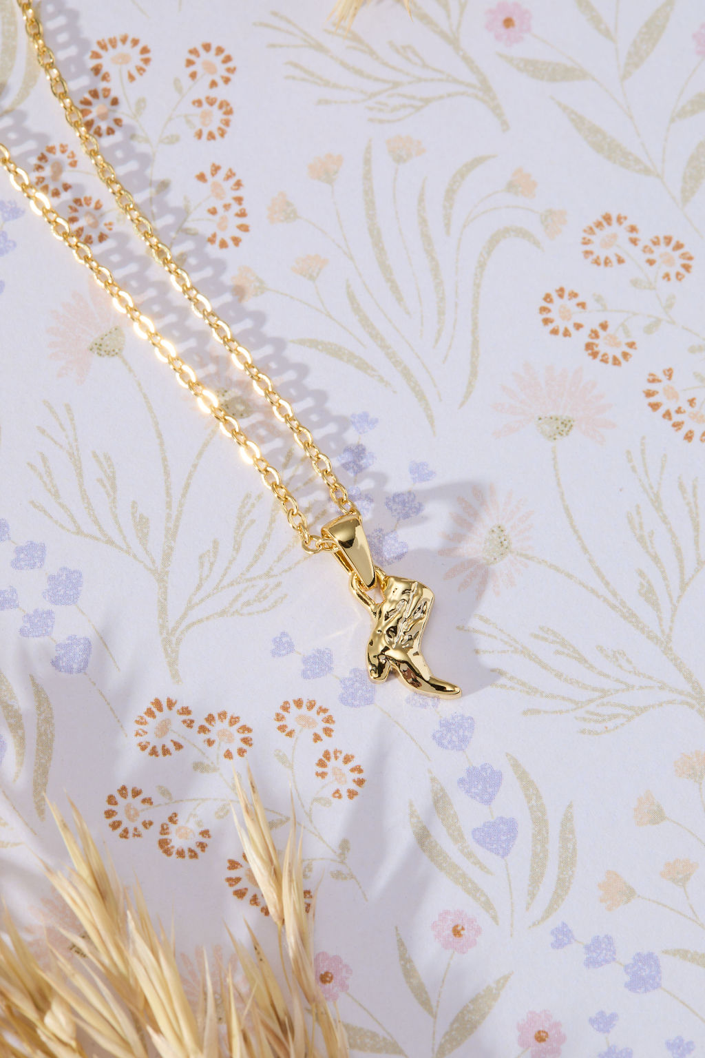A petite cowboy boot pendant on a 16" chain with a 2" extender. Whether in warm gold, this piece adds a touch of Western charm to your everyday look. Perfect for the cowgirl at heart—just add boots and a little giddy up!