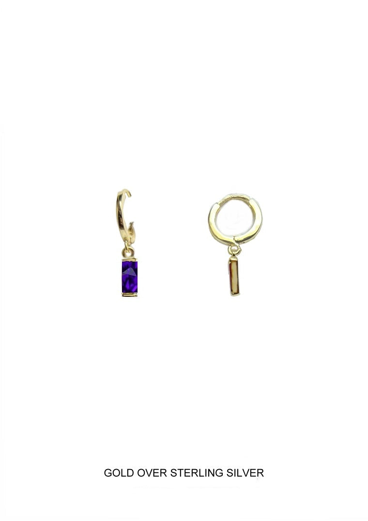 Sophisticated and striking, Royal gold huggie hoop earrings feature a dangling CZ baguette in deep purple.