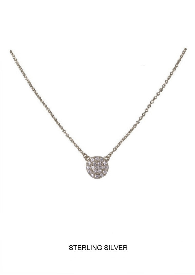 Subtle yet radiant, the Luna Glow necklace features a round silver disc encrusted with shimmering pavé cubic zirconia. Set on a 16" chain with a 1" extender, this minimalist piece adds a touch of celestial sparkle to any outfit—perfect for everyday wear or special occasions.