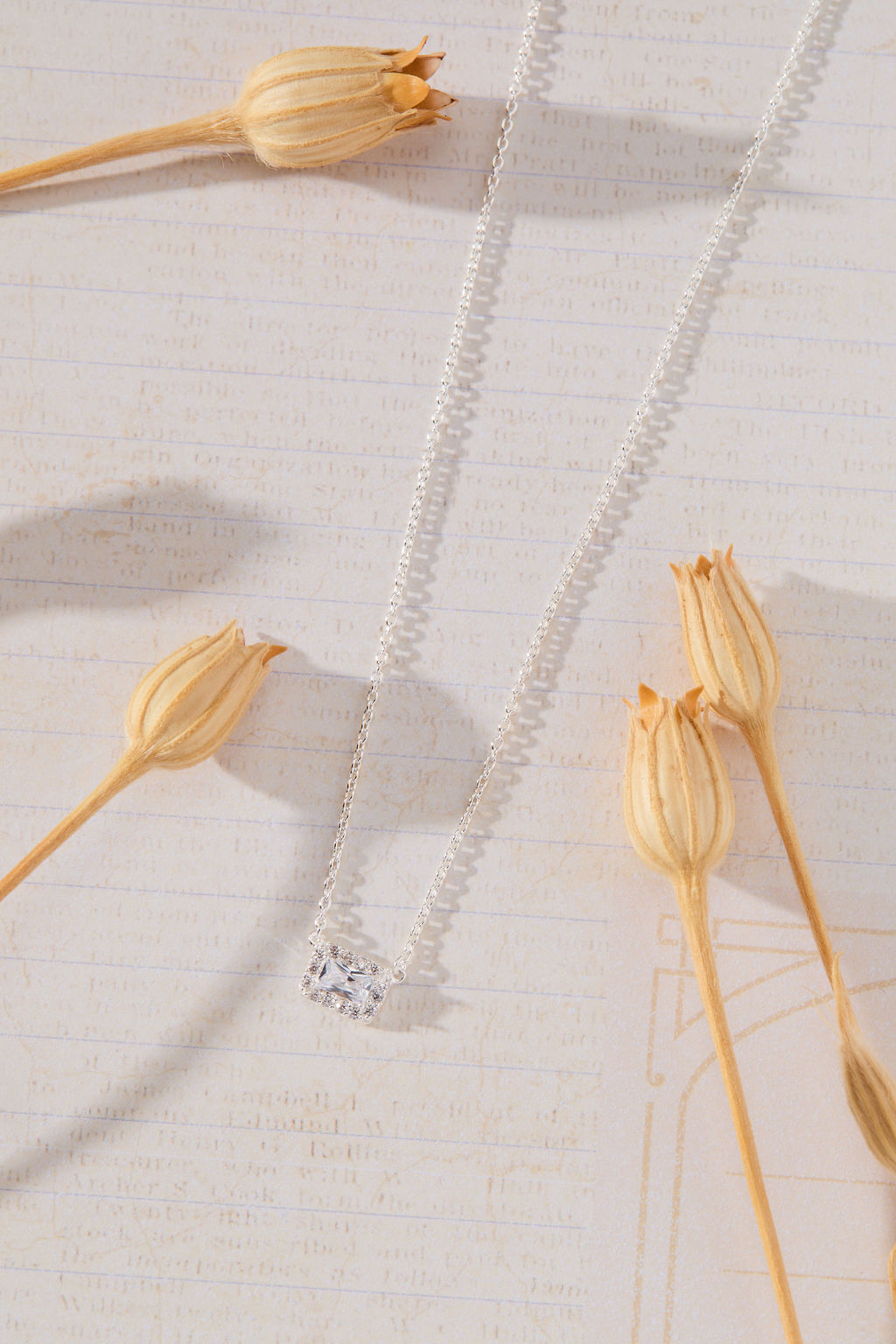 Classic sparkle meets modern simplicity in the Radiant Grace Necklace. Featuring a rectangular Cubic Zirconia center stone framed by a delicate halo of shimmering CZs, this silver piece is your go-to for everyday elegance or special occasions. Dainty yet eye-catching, it’s a reminder that quiet confidence always shines through.