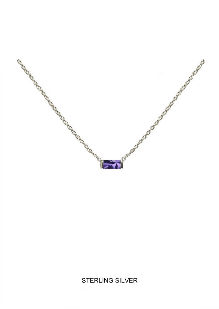 Delicate and elegant, Harmony features a 16" sterling silver chain with a 2" extender and a horizontally set CZ baguette in soft lavender.