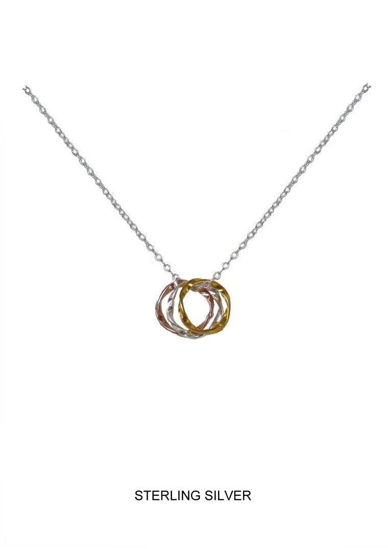 A modern twist on classic elegance, this necklace features three medium-sized interlocking circles in gold, silver, and rose gold tones. Suspended on a 16" chain with a 2" extender, the tri-tone design adds versatile shine and dimension to any outfit. Perfect for layering or wearing solo, it’s a timeless statement of harmony and balance.