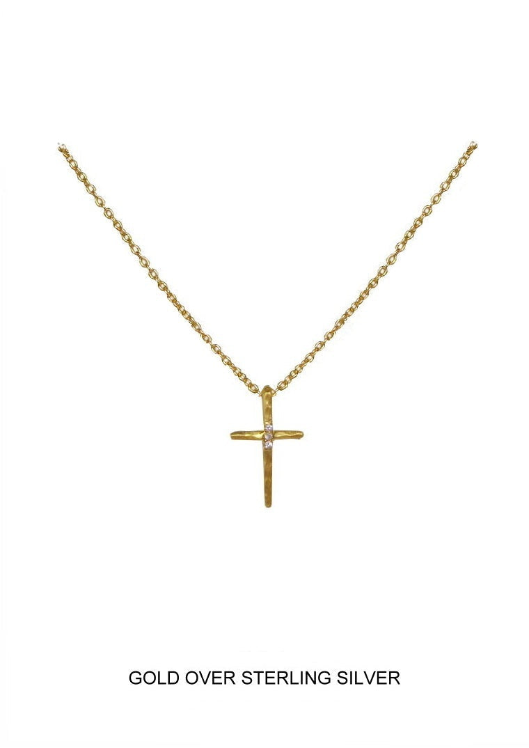 A rustic take on sacred simplicity, this hammered gold cross evokes the look of hand-carved wood. Three tiny CZ stones are nestled at the center, symbolizing the Father, Son, and Holy Spirit. Crafted in 14k gold over sterling silver, it comes on a 16" chain with a 1" extender—designed to layer, gift, or wear daily in quiet faith.